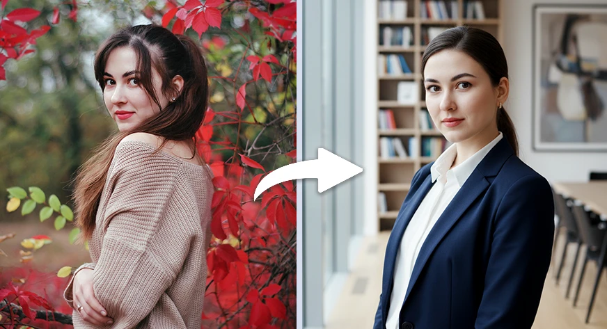“Remodel this picture into an expert LinkedIn headshot. Make sure the individual is wanting straight on the digicam with a assured, relaxed expression.